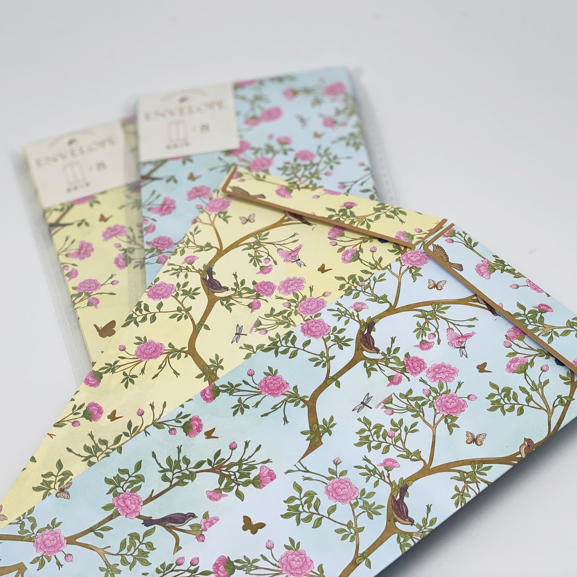 Entdecke unsere farbenfrohen Sets bestehend aus Briefpapier und/oder passenden Umschlägen im eleganten French Chinoiserie Design. Inspiriert von der kunstvollen Ästhetik des 18. Jahrhunderts, kombiniert dieses Design französischen Vintage-Charme mit mit Vögeln, Blüten und Schmetterlingen fernöstlicher Anmut.